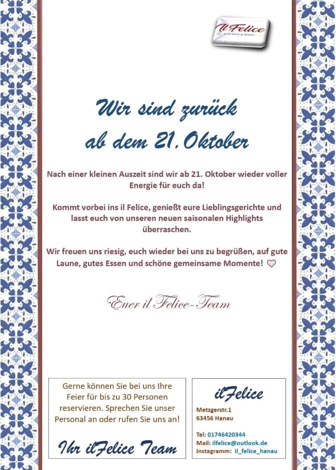 Anfragen bitte telefonisch oder per email an info@il-felice.restaurant